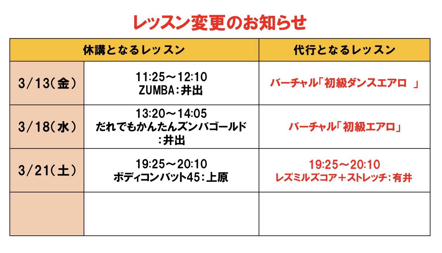 3/13(金)以降のレッスン変更のお知らせです。